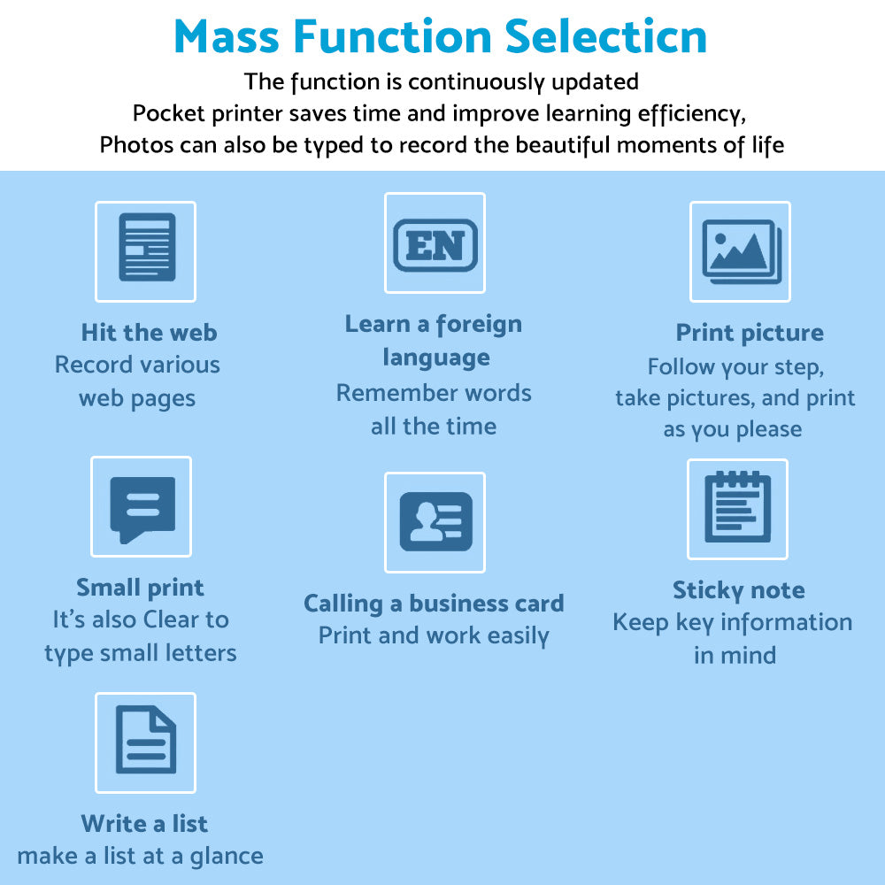 Multifunction: Support Wireless BT 4.0 connected with smartphone. Support multiple functions, it can print photos, labels, messages, lists, records, wrong question, web printing and so on.