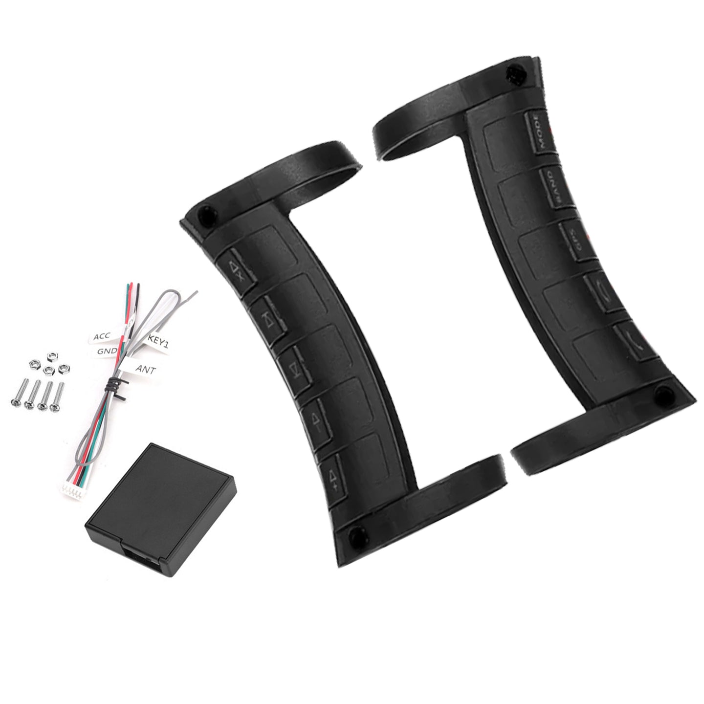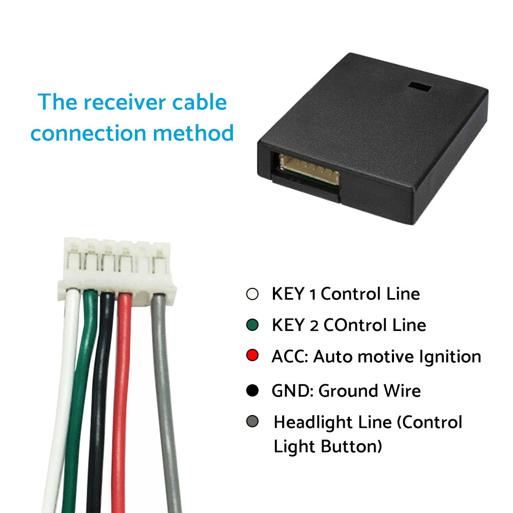 3.The receiver has a corresponding bit line marking stickers ACC for automotive ignition wire, GND wire, KEY1, and KEY2 side control line, will connect the corresponding line, if only one party host navigation control line, please receive box with green and white line at the same time and received the navigation, for receiving antenna yellow. Please install after straightened as close as possible to the steering wheel, away from the navigation host location without fixed wiring.